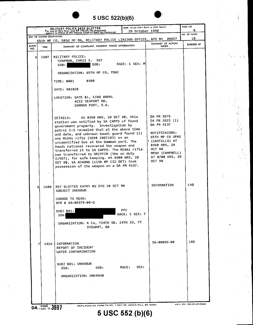 Subject = MILITARY POLICE DESK BLOTTER 28 OCT 90