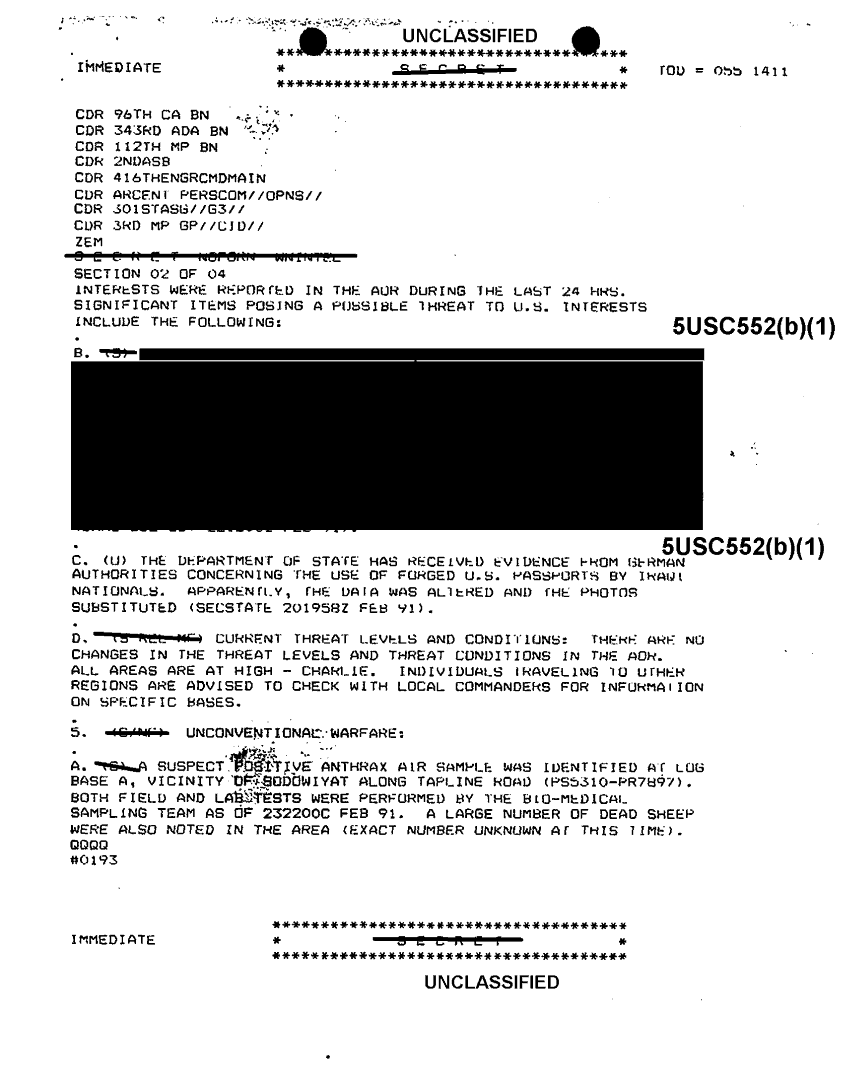 Document 16 f:/Week-32/BX000502/TACTICAL OPERATIONS CENTER LOGS-INCOMING MESSAGE FILES- 24 TO 26 FEB 91/arcent rear area threat summary:11089615160275