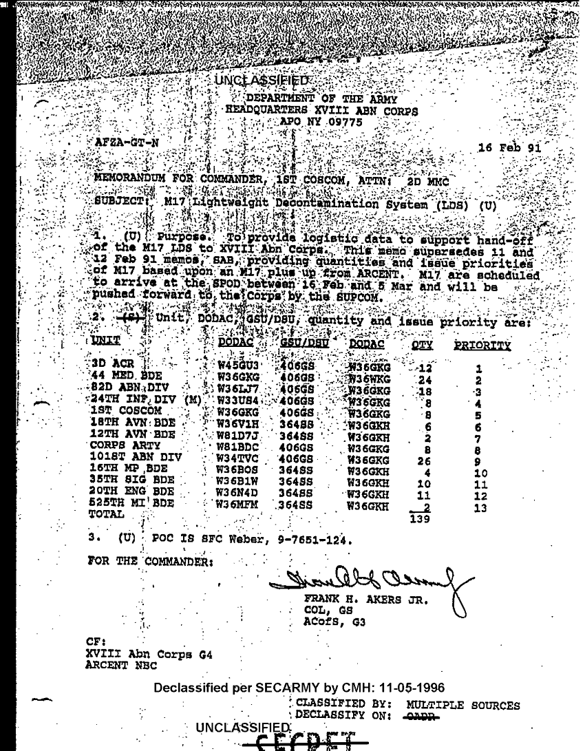 Subject = M17 LIGHTWEIGHT DECONTAMINATION SYSTEM LDS 16 F