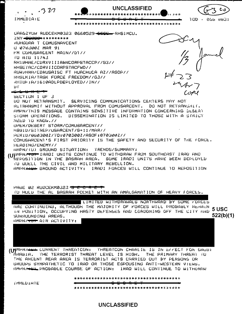 Document 7 f:/Week-29/BX000421/TACTICAL OPERATIONS CENTER LOGS - LUCKY TAC JOURNALS 8-14 MAR 91/sitrep usarcent 7 mar 91:11089615144531