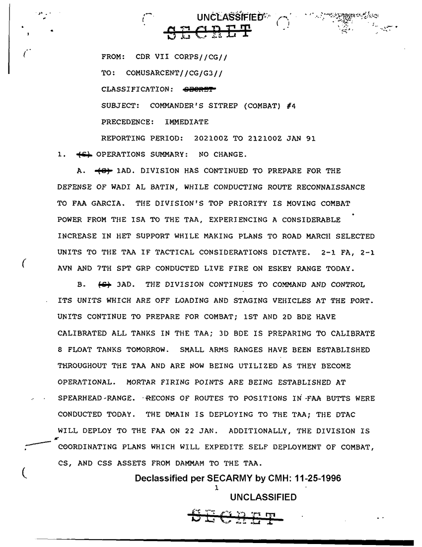 Subject = CMDR S SITREP CBT 4 21 JAN 91