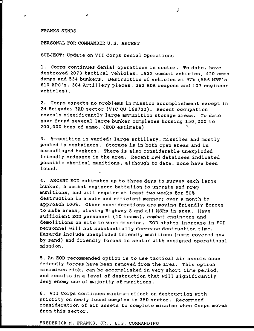 Subject = UPDATE ON VII CORPS DENIAL OPERATIONS