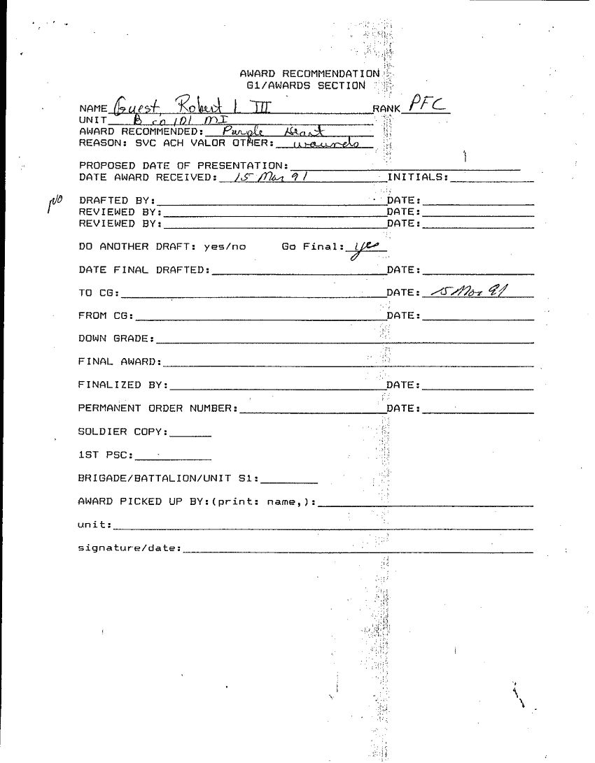 Document 78 f:/Week-26/BX001004/AWARD GUEST ROBERT L III-1/casualty report award of the purple heart:12179611151925