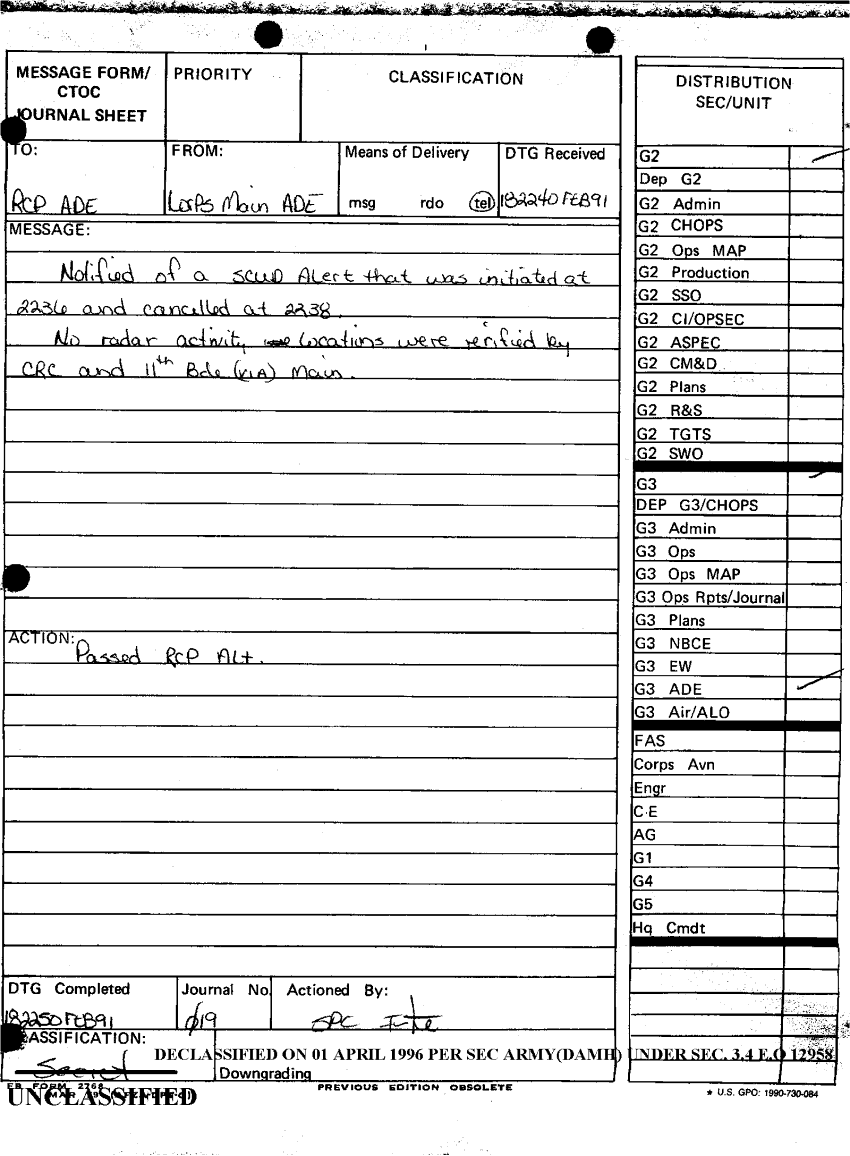 Document 1 f:/Week-09/BX000019/DUTY LOG G3 REAR 19 FEB 91/message form 22 feb 91:12179611161181