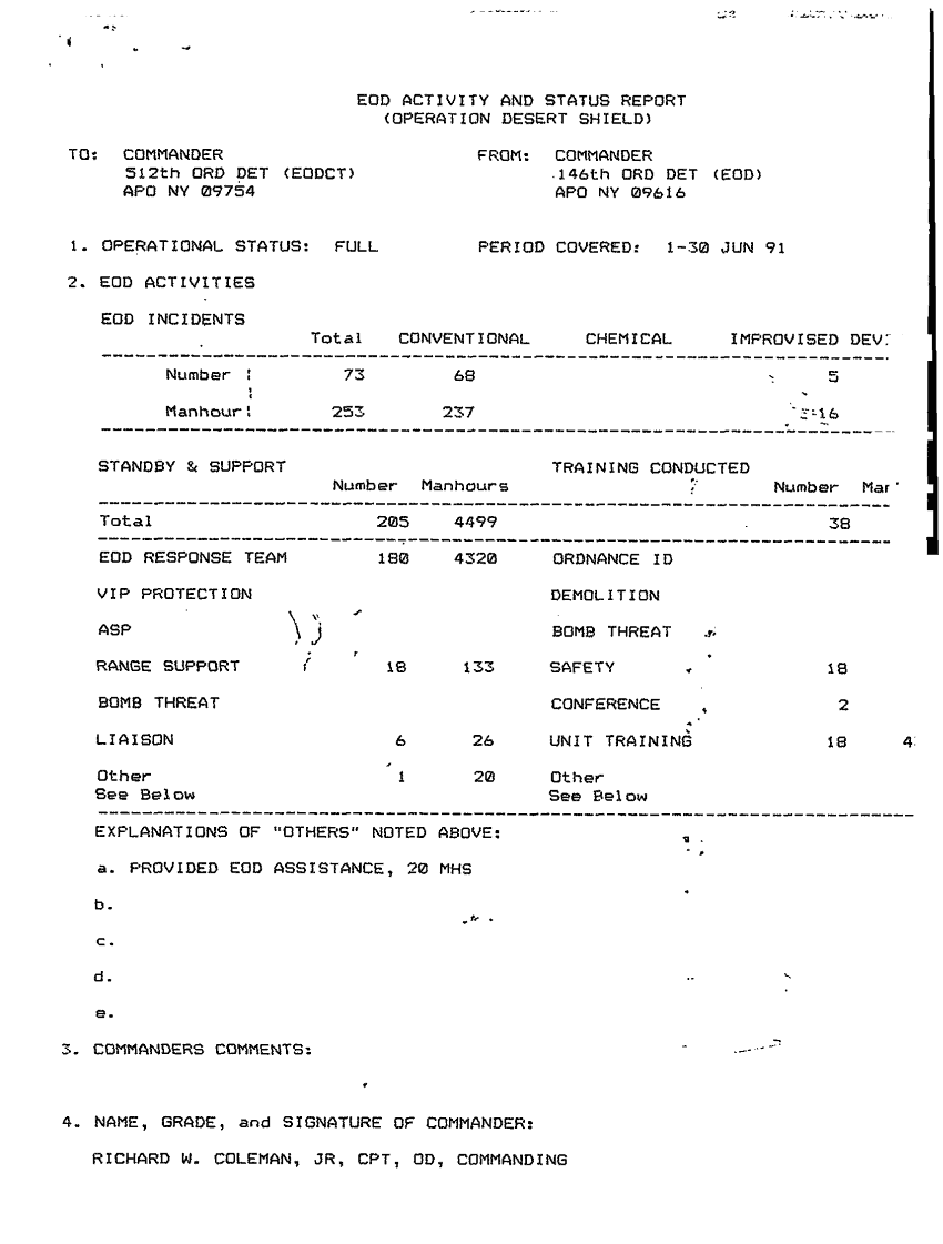 Document 12 f:/Week-46/BX005555/512TH EODCT SUBORD UNIT JOURNALS EOD INCIDENTS/eod activity and status report ods 1 30 jun 91:121796111633105