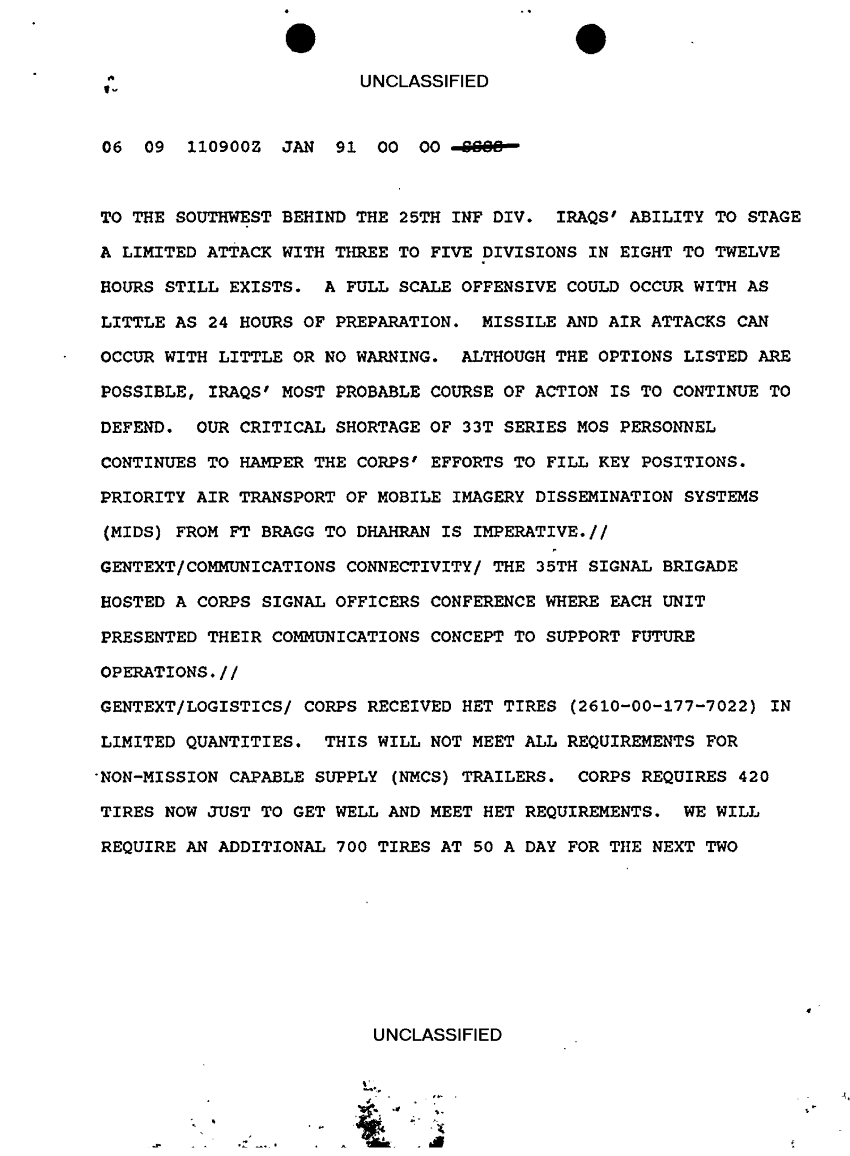 Document 9 f:/Week-10/BX000020/DUTY LOG G3 REAR XVIII ABC MAIN SITREPS JAN 91/message dated 11 jan 91:12269616085559