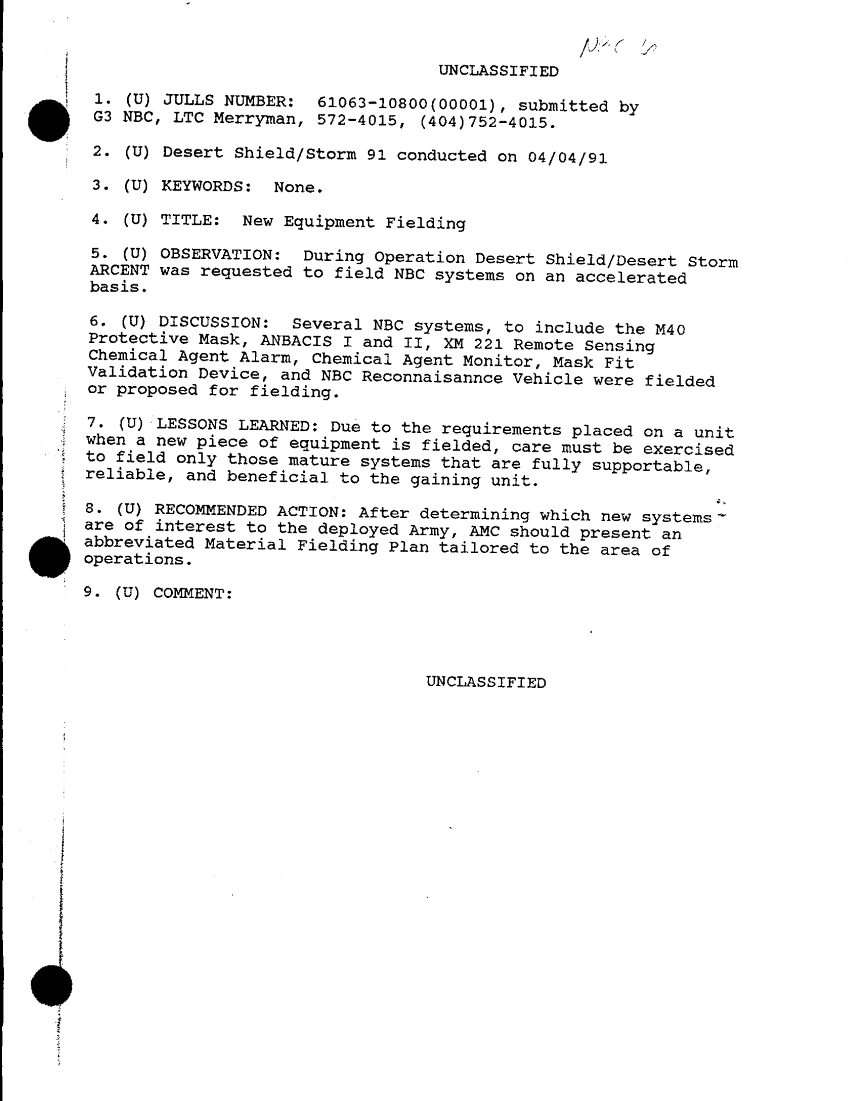 Document 1 f:/Week-29/BX000425/COMMAND REPORTS - MISC RTPS ENEMY CHEM WPNS - G3 MANNING REPORT - ARCENT REORG/new equipment fielding:0102971552529