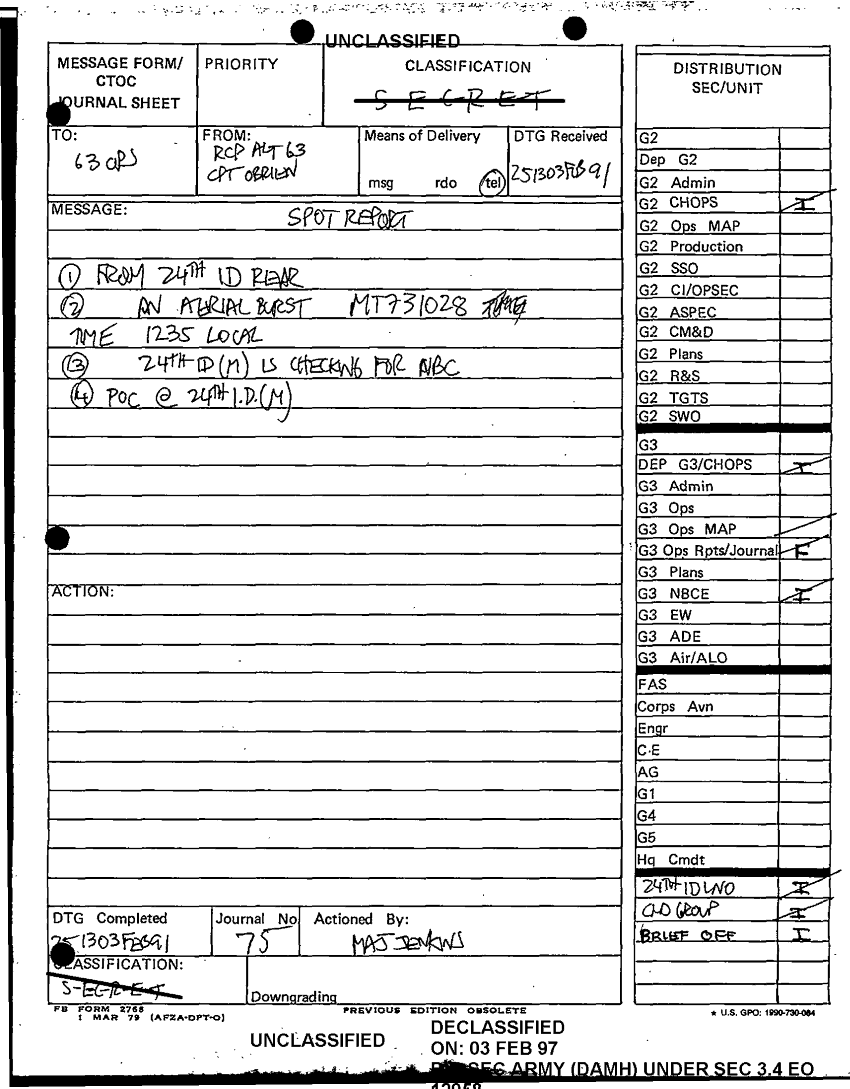 Document 1 f:/Week-48/BX000079/DAILY JOURNAL-STAFF JOURNAL AND TACTICAL OPNS CTR LOGS-25 FEB 91/msg spot report 24 id rear 25 feb 91:03069709502947