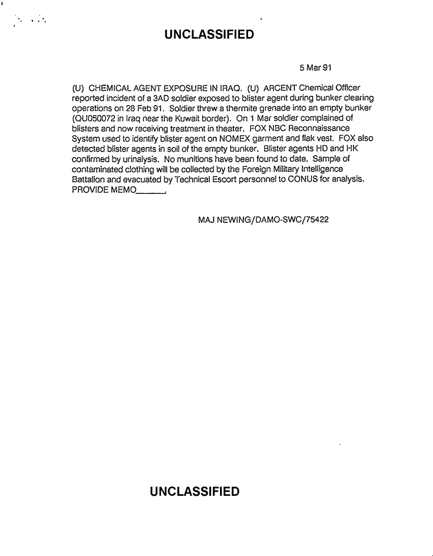 Subject = CHEMICAL AGENT EXPOSURE IN IRAQ 5 MAR 91