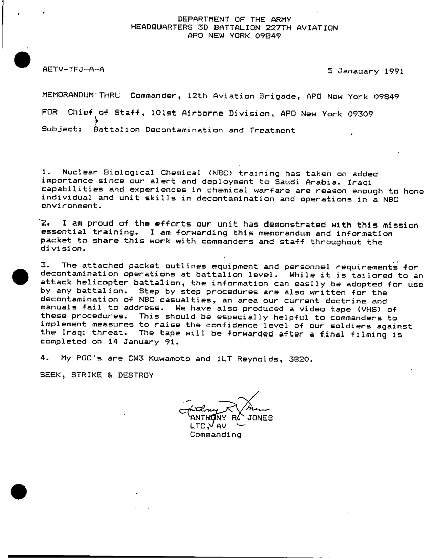 Subject = BATTALION DECONTAMINATION AND TREATMENT 5 JAN 91