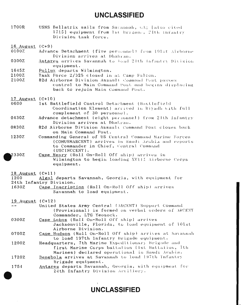 Subject = XVIII AIRBORNE CORPS OPERATION DESERT SHIELD CHRONOLOGY