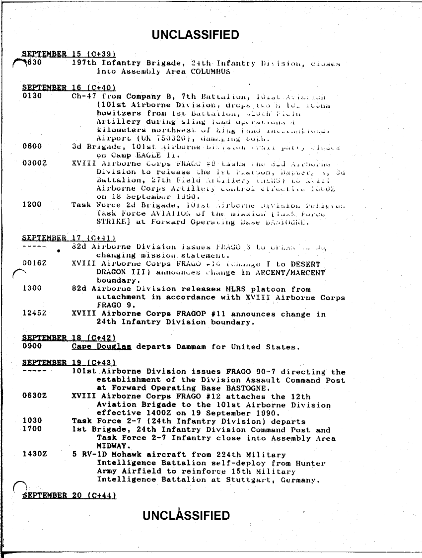 Subject = XVIII AIRBORNE CORPS OPERATION DESERT SHIELD CHRONOLOGY