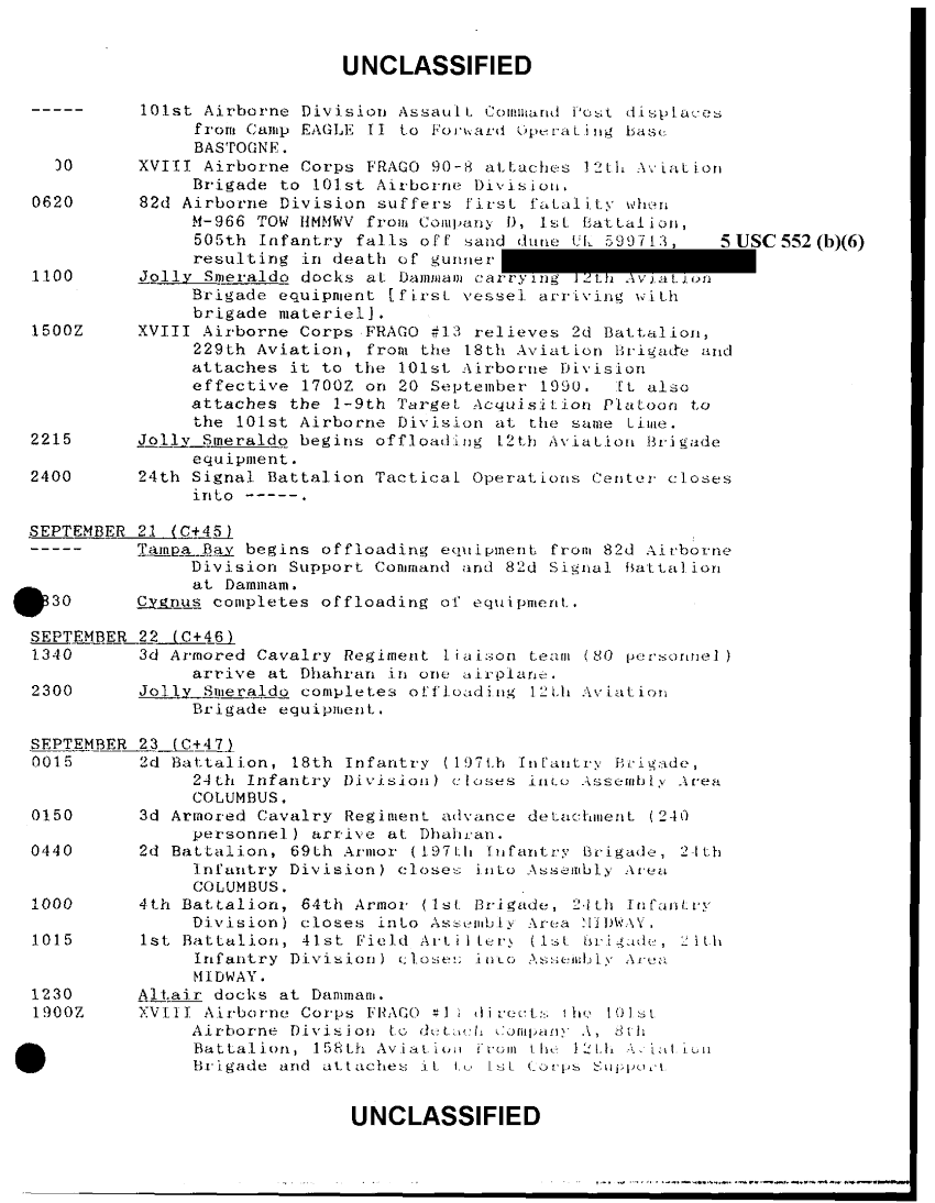 Subject = XVIII AIRBORNE CORPS OPERATION DESERT SHIELD CHRONOLOGY