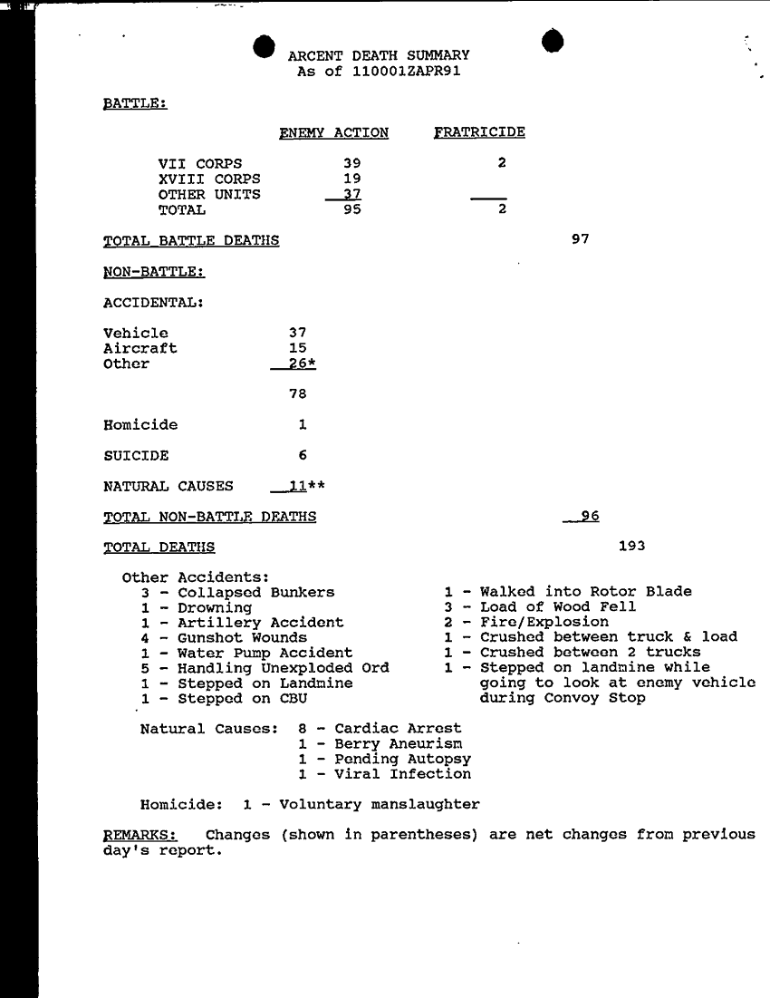 Document 1 f:/Week-28/BX000411/COMMAND REPORTS-PERSTATS JAN-MAR 91 PART 1/arcent death summary as of 11 apr 91:050997114006116