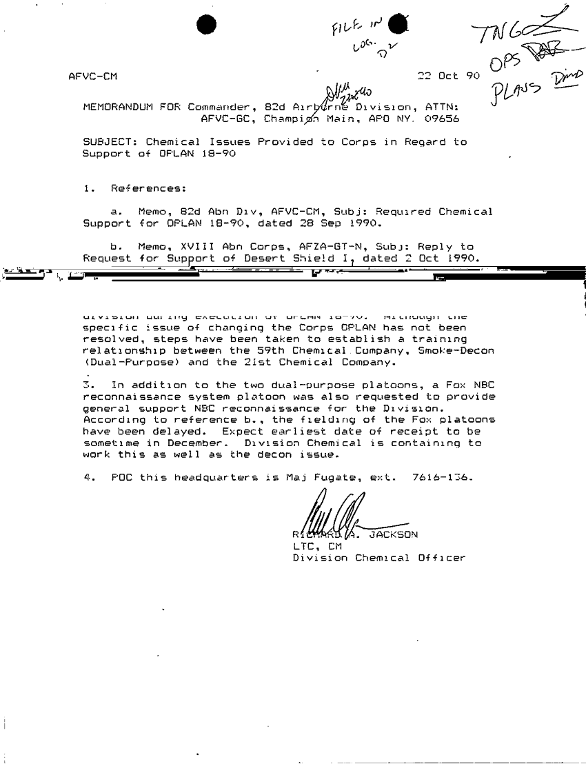 Document 1 f:/Week-64/BX001510/G3 PLANS DUTY LOG 29-31 OCT 90/chemical issues provided corps in regard to spt of oplan 18 90:08289707513512