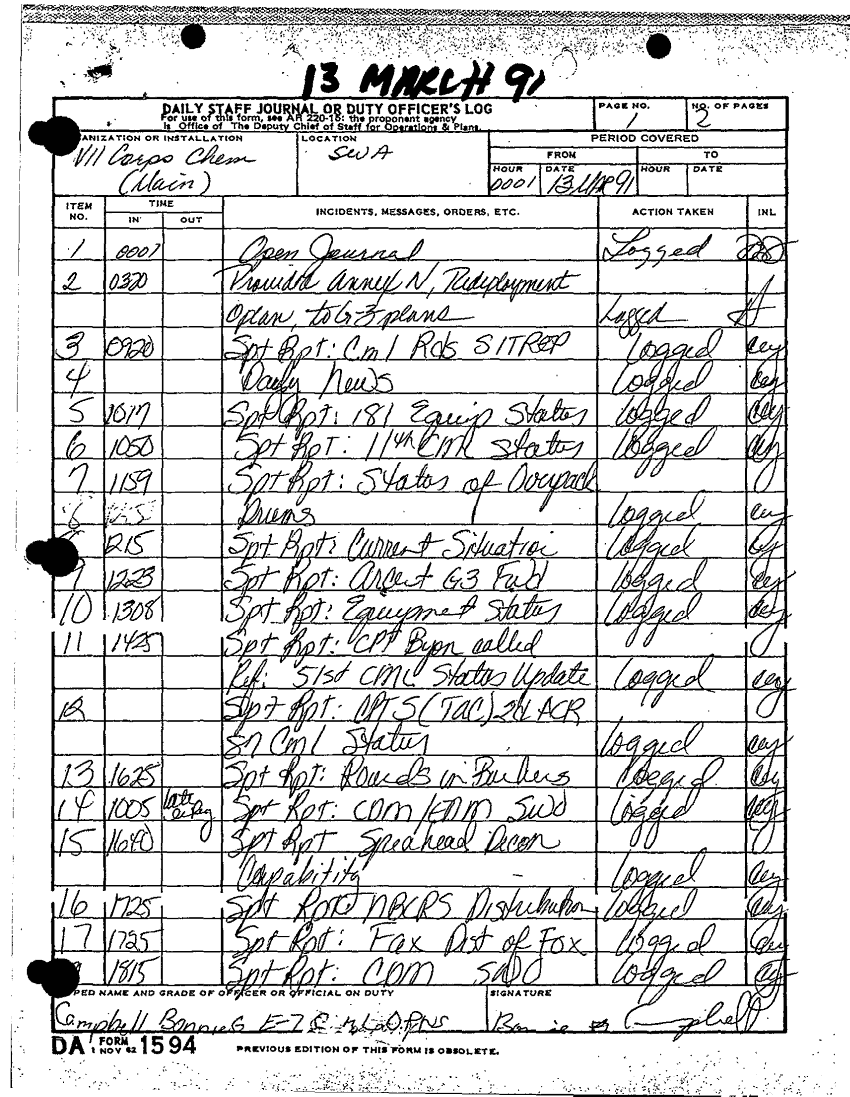 Document 19 f:/Week-25/BX000231/0007 CORPS CHEMICAL BOOK THREE-FOLDER 2 OF 2/daily staff journal or duty officers log 13 mar 91:0922971201259