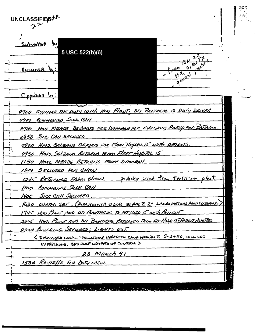 Document 49 f:/Week-37/BX303811/VARIOUS NAVAL MESSAGES FOLDER 4/various journal entries sick call 22 mar 91:0324971041562