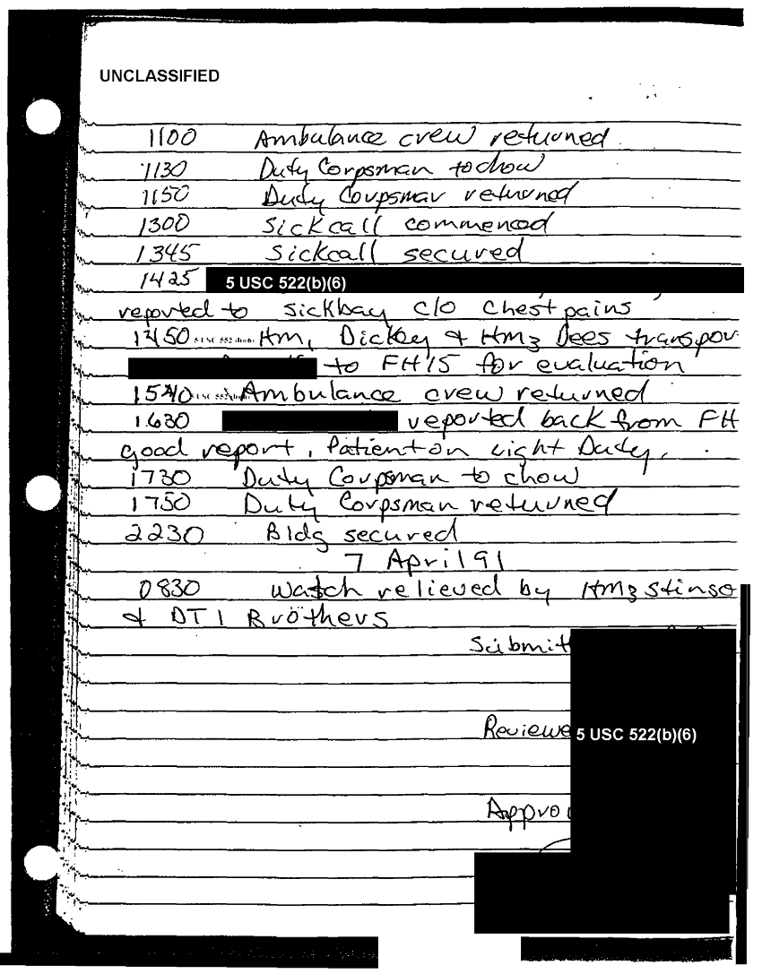 Document 49 f:/Week-37/BX303811/VARIOUS NAVAL MESSAGES FOLDER 4/various journal entries sick call 22 mar 91:0324971041562