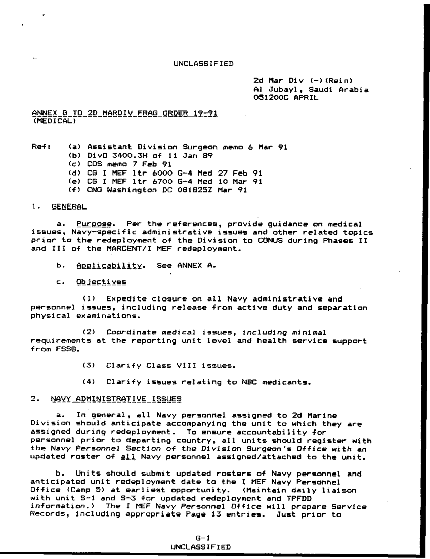 Document 7 f:/Week-35/BX600014/COMMAND CHRONOLOGY 2ND MARINE DIVISION 14 APR - JUN 91/frag order redeployment 19 91:1018961454042