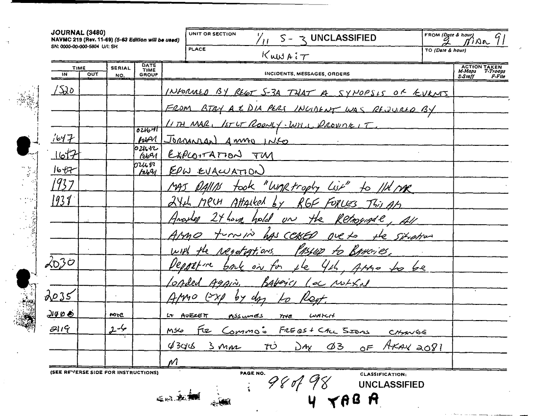 Folder Title = COMMAND CHRONOLOGY 1ST BATTALION 11TH MARINES JAN - FEB 1991