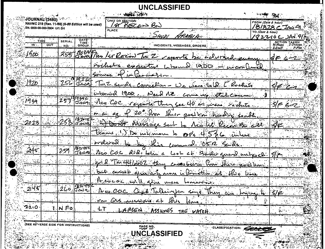 Document 9 f:/Week-38/BX600020/COMMAND CHRONOLOGY 1ST RECONNAISSANCE BATTALION JAN - MAR 1991/1st recon bn journal 18 jan 91:12069615400919