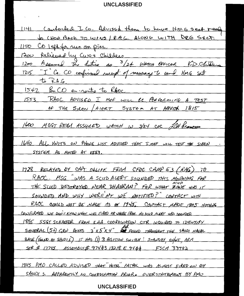Document 103 f:/Week-35/BX600013/COMMAND CHRONOLOGY 3RD BATTALION 24TH MARINES JAN - MAR 1991 4 OF 4/handwritten log:0102970950272