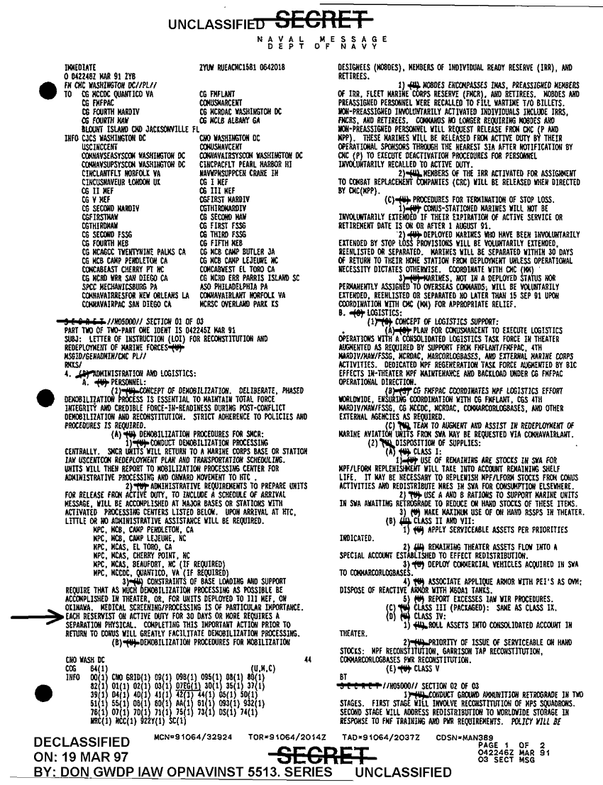 Document 2 f:/Week-52/BX600124/HQMC - DESERT STORM MESSAGE FILE MAR 91 CNA 8803/loi for reconstitution and redeployment of marine forces 4 mar:03249710492428