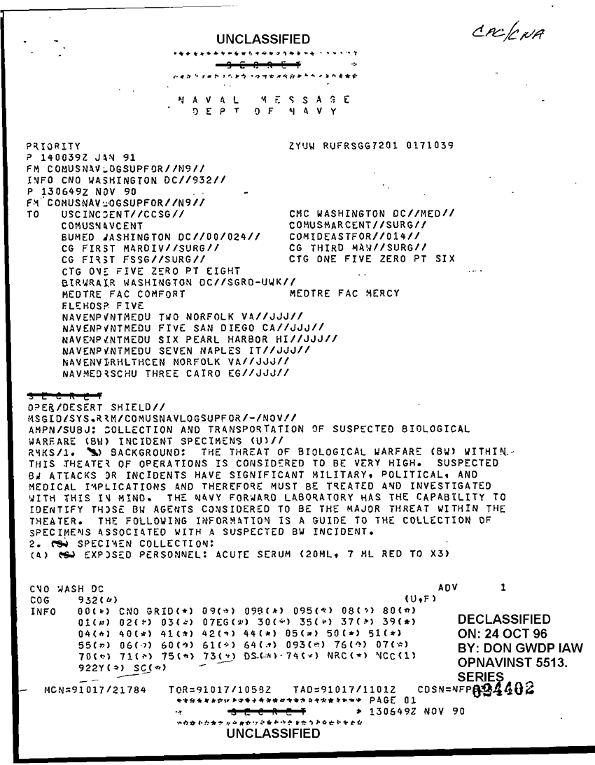 Document 3 f:/Week-41/BX300104/COMUSNAVLOGSUPFOR NAVY MEDICAL MESSAGE FILES 1990-1991 CNA 2910/collection and transportation of suspected bw sp:11129610111011