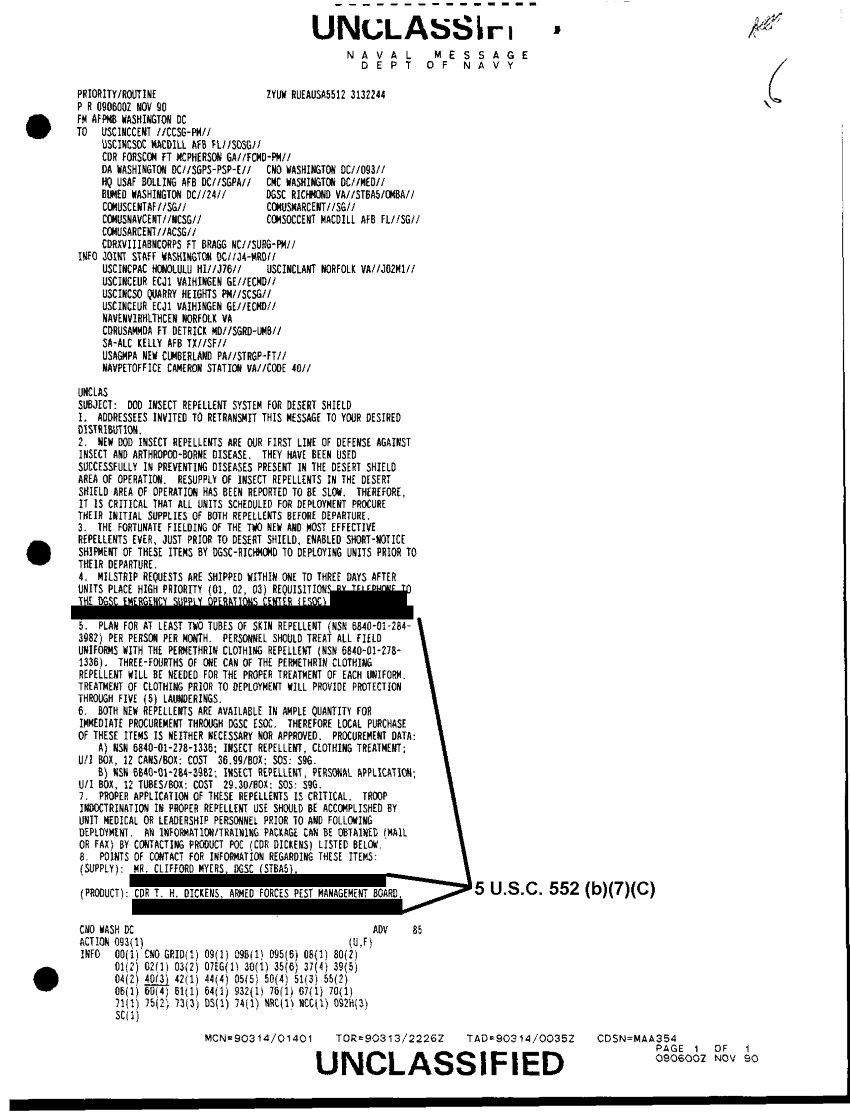 Document 1 f:/Week-41/BX300109/FOLDER MESSAGE CHRONOLOGICAL FILES 14 NOV - DEC 90 5 OF 26/dod insect repellant system for desert shield:1206961536579