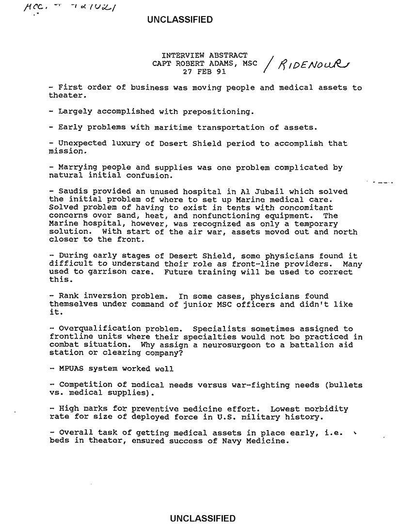 Document 2 f:/Week-46/BX300235/NAVCENT INTERVIEW ABSTRACT CAPT ROBERT ADAMS MSC 27 FEB 91/interview absteract 27 feb 91:1217960957546