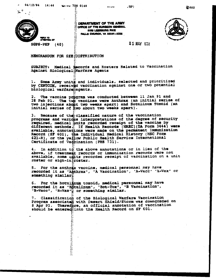 Subject = MED RCDS RELATED TO VACCINATION BIO WARFARE AGEN