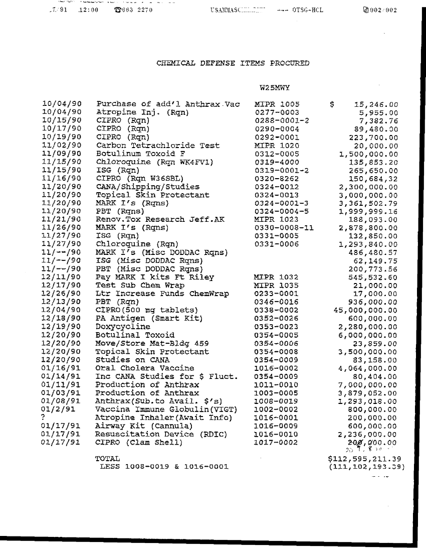 Document 3 f:/Week-36/BX003201/CRITICAL DESERT SHIELD FUNDING NEEDED BY 3 JAN 91/chemical defense items producded:12179609281020