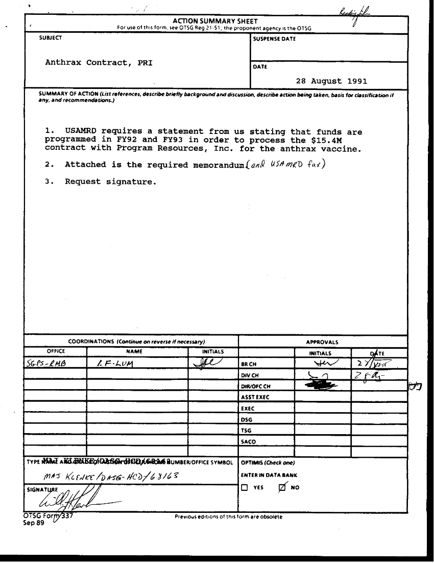 Subject = ACTION SUMMARY SHEET 28 AUG 91