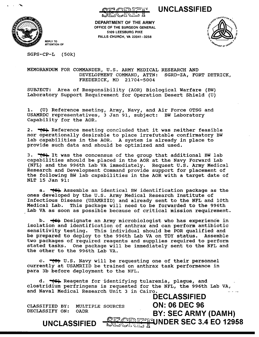 Subject = AOR BIOLOGICAL WAREFARE LAB RPT REQUIREMENT FOR