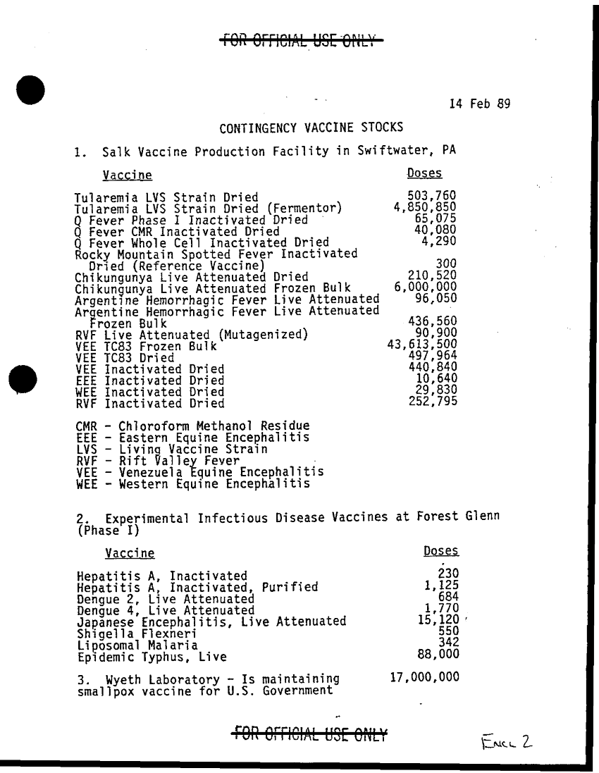 Subject = CONTINGENCY VACCINE STOCKS 14 FEB 89