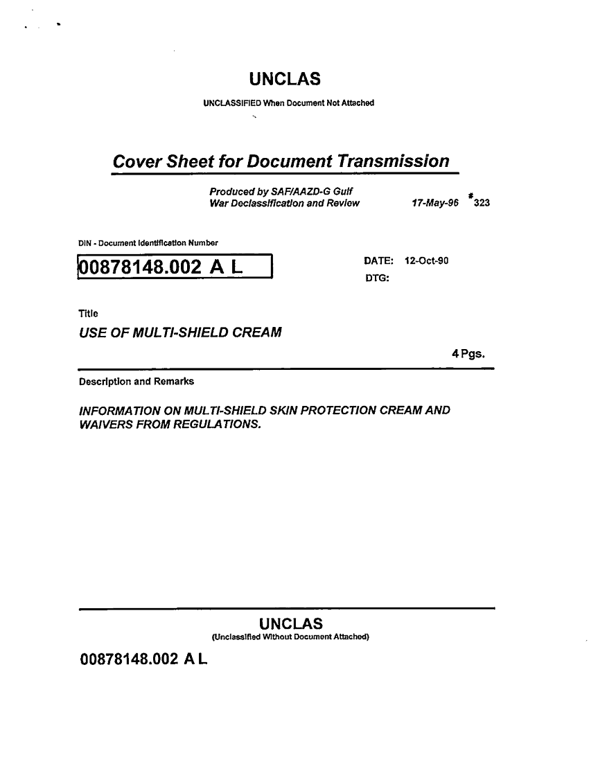 Document 5 f:/Week-36/BX003205/USE OF CHEMICAL WARFARE AGENT TOPICAL SKIL PROTECTANT/cover sheet for document transmission:12249609312319