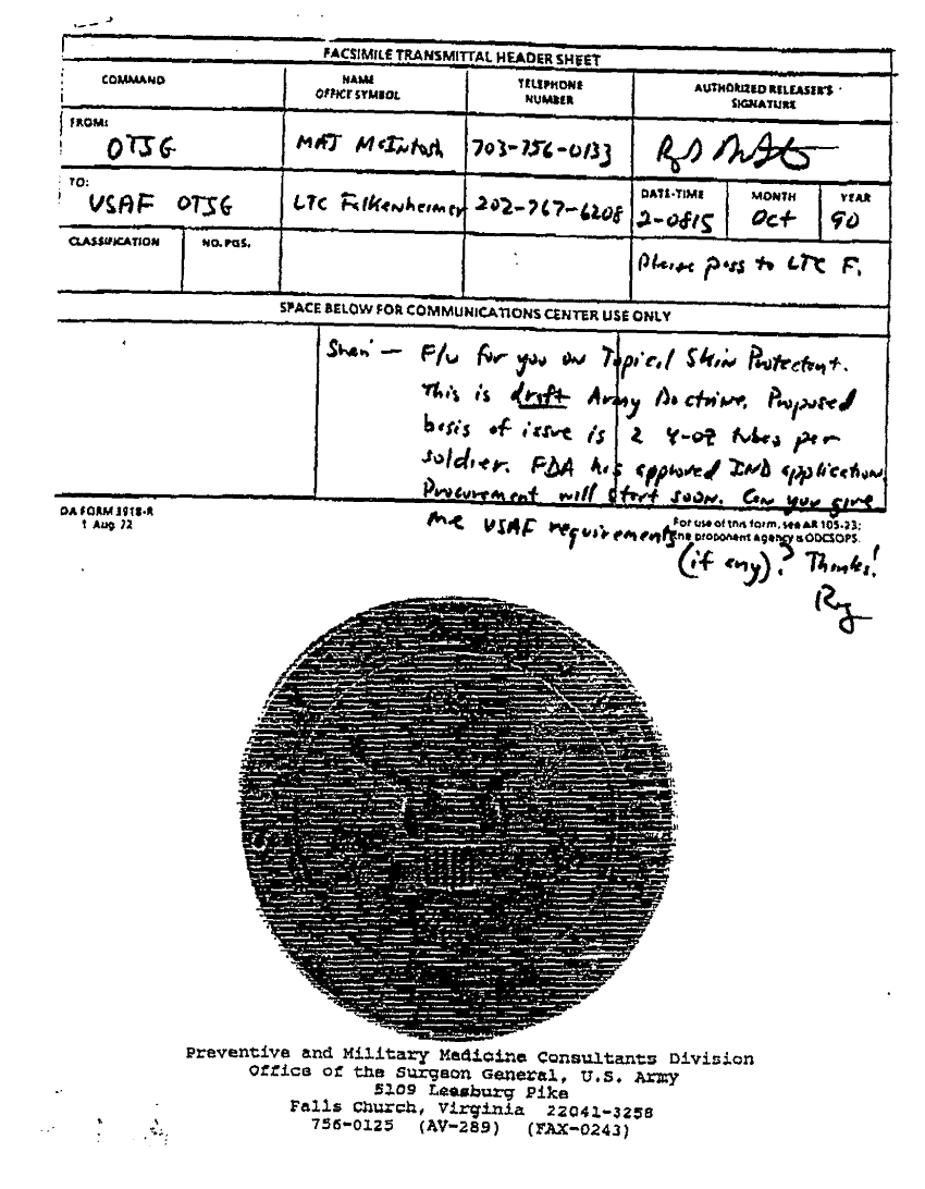 Document 10 f:/Week-36/BX003205/USE OF CHEMICAL WARFARE AGENT TOPICAL SKIL PROTECTANT/cover sheet for document transmisson:12249609314158