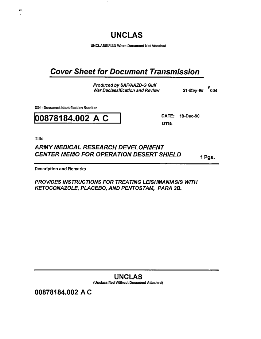 Document 2 f:/Week-36/BX003205/TREATING LEISHMANIASIS WITH KETOCONAZOLE-PLACEBO AND PENTOSTAM/army medical research development center memo:12249609314259