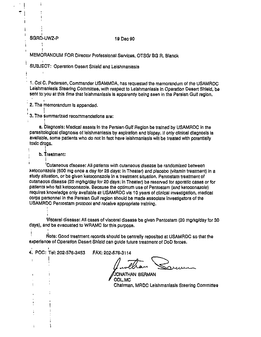 Document 2 f:/Week-36/BX003205/TREATING LEISHMANIASIS WITH KETOCONAZOLE-PLACEBO AND PENTOSTAM/army medical research development center memo:12249609314259