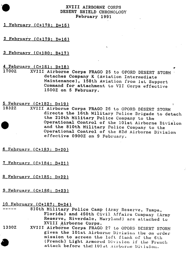 XVIII Corps Desert Shield Chronology, Feb 1991
