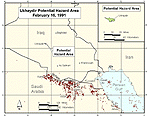 Lower evaporation rates from the crater and calm winds slowed dispersion further on the third day. That days winds were out of the southeast and pushed the hazard area approximately 20 kilometers to the northwest, away from US troops. (See Figure 17.)